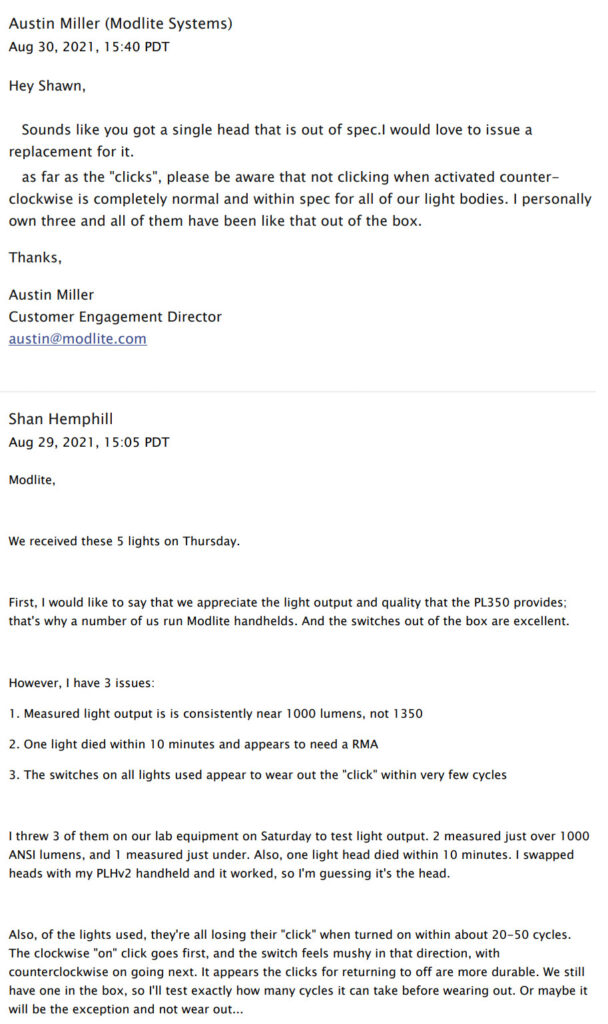 I contacted Modlite about our issues, and specifically asked why the PL350 did not to meet the lumens spec, along with a couple other questions. During the email conversation, I asked 3 times about why their light did not appear to meet their 1350 lumen spec. All 3 times, Modlite ignored the question, but did answer my other concerns.