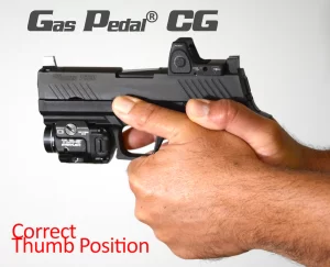 Taking a look at some forum comments, it appears that there are a number of people that love the Gas Pedal. But it also appears that if someone doesn’t get the grip correct, then they’ll have difficulty. The Gas Pedal requires what Dr. Chet calls an “opposable grip.” In short, you don’t use the gas pedal to drive the pistol down, but you press inward and toward the barrel while squeezing with your fingers. This “opposes” trigger finger influence. It also explains the shape, which puts significant material between your thumb and the slide — this is to allow your thumb to ride higher and press inward without interfering with the slide.