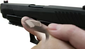 1. Thanks Shan for your detailed review and glad to hear you like the thumb rest takedown lever for the P320. As mentioned in the article, the fingerprint should press flat upon the ledge for proper placement, however, there should be a moderate application of pressure onto the ledge to ensure the thumb is securely planted for proper traction. The wording of “thumb rest” is a commonly recognized generic term for loosely illustrating how the part is interfaced and really serves to be easily found in searches vs. an instruction. Shooters should stiffen to lock their thumb and wrist together as a single unit to effectively create a wall that prevents the muzzle from rising past it as the main intent. We recommend just not “muscling” the ledge as to prevent a porpoising action where the sights might dip below the target upon recovery of recoil. If too much force is being applied, that would cause slippage in either product as they are both low-profiled.
