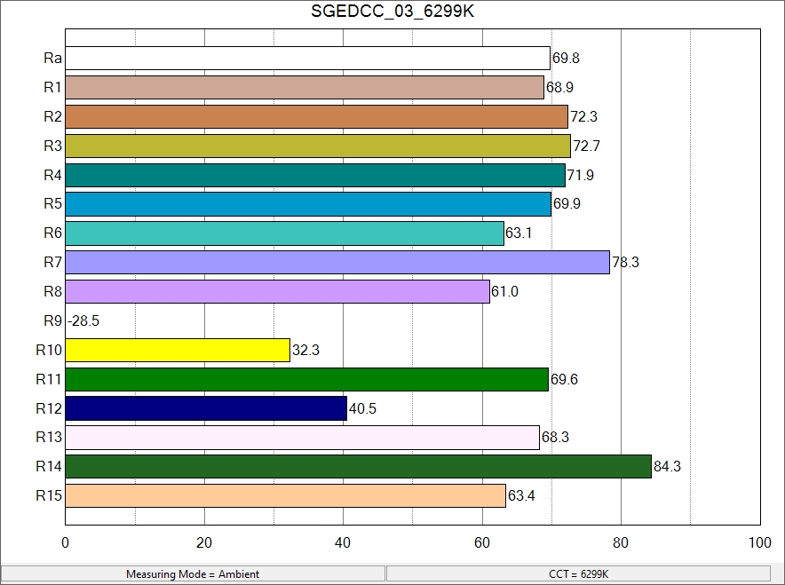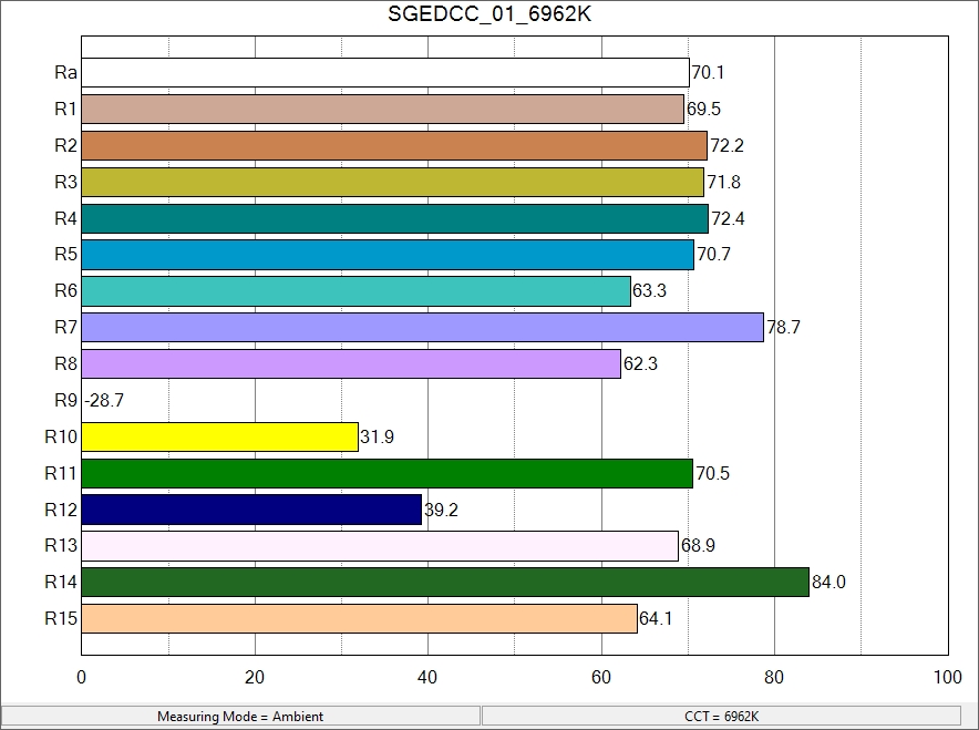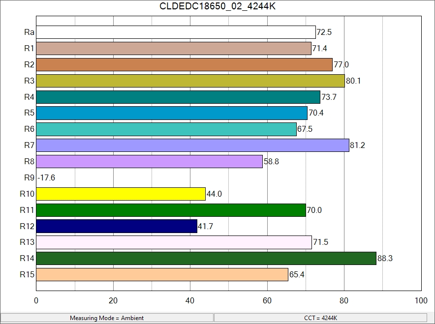 Tactical, high-output lights often have an Ra (that is, CRI) of ~70 and light temperature of ~6000K. Going by my second readings, this light is right about there.