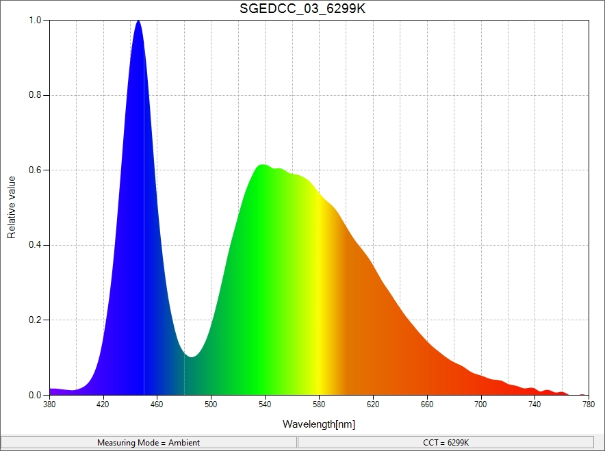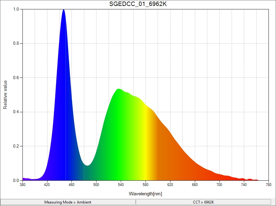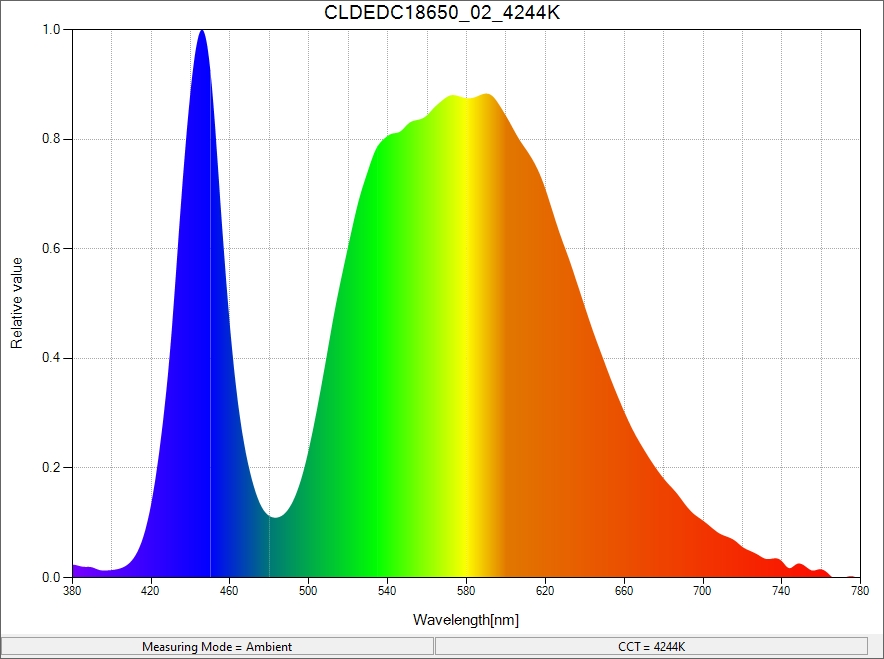 In real world use, you would not focus on these rings of blue light. So I took another reading, this time shining the flashlight straight into the spectrometer, thus getting a reading of the center-point of the light’s beam. This should match up a bit closer to how the flashlight will appear in real-world use: