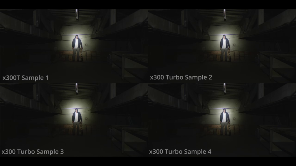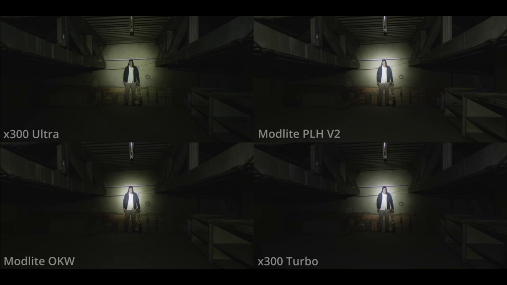 Here you can see slight variations in output, flood, and color temperature. The X300U appears most dim. The other 3 lights are very competitive.
